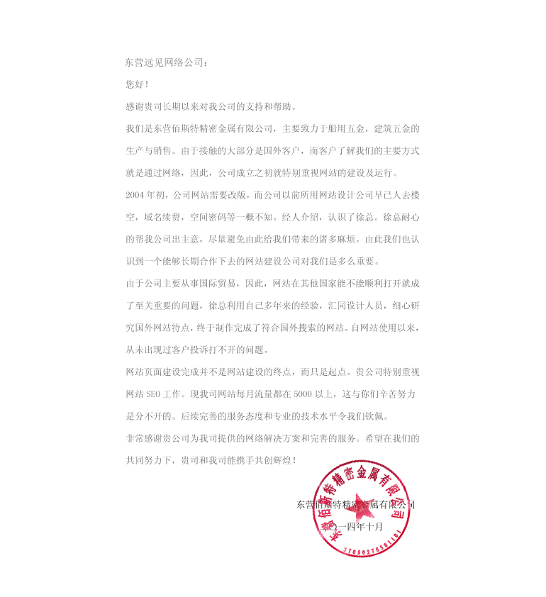 我們是東營佰斯特精密金屬有限公司,主要致力于船用五金,建筑五企的生產(chǎn)與銷售。由于接觸的大分是國外客戶,而客宜戶了解我們的主要方式就是通過網(wǎng)路,因此,公司成立之初就特別重視網(wǎng)站的建投及運(yùn)行。